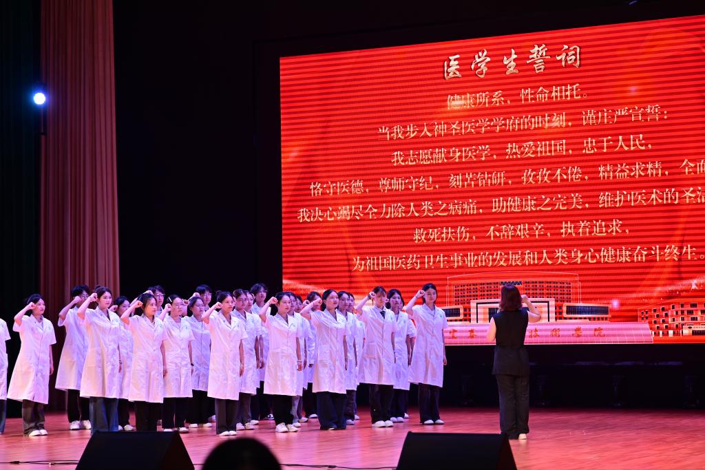 会议末尾,医学院副院长周围带领全体2025级新生庄严宣誓。铿锵誓言响彻大会堂,既是新生对医学事业的郑重承诺,也是学院深化医德医风教育、培育高素质医学人才的生动实践。