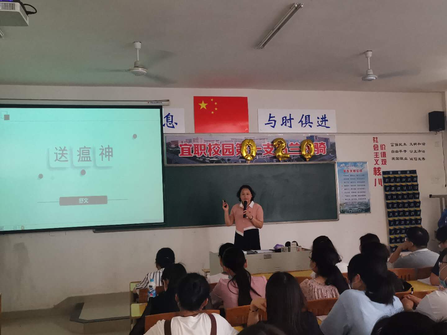 舒文以毛泽东同志的七律诗歌《送瘟神》为引子,阐述了新中国成立以来,全国各族人民在中国共产党的坚强领导下,战胜天花、血吸虫病等传染病的伟大斗争历史;回顾了自2019年12月以来,党领导全国人民防控新冠肺炎疫情的重要日程;讲述了在新冠肺炎疫情防控过程中,我院全体党员和校友纷纷慷慨解囊,为疫情防控捐款、捐物,积极投入到全民抗疫这场伟大的人民战争当中去的感人故事。