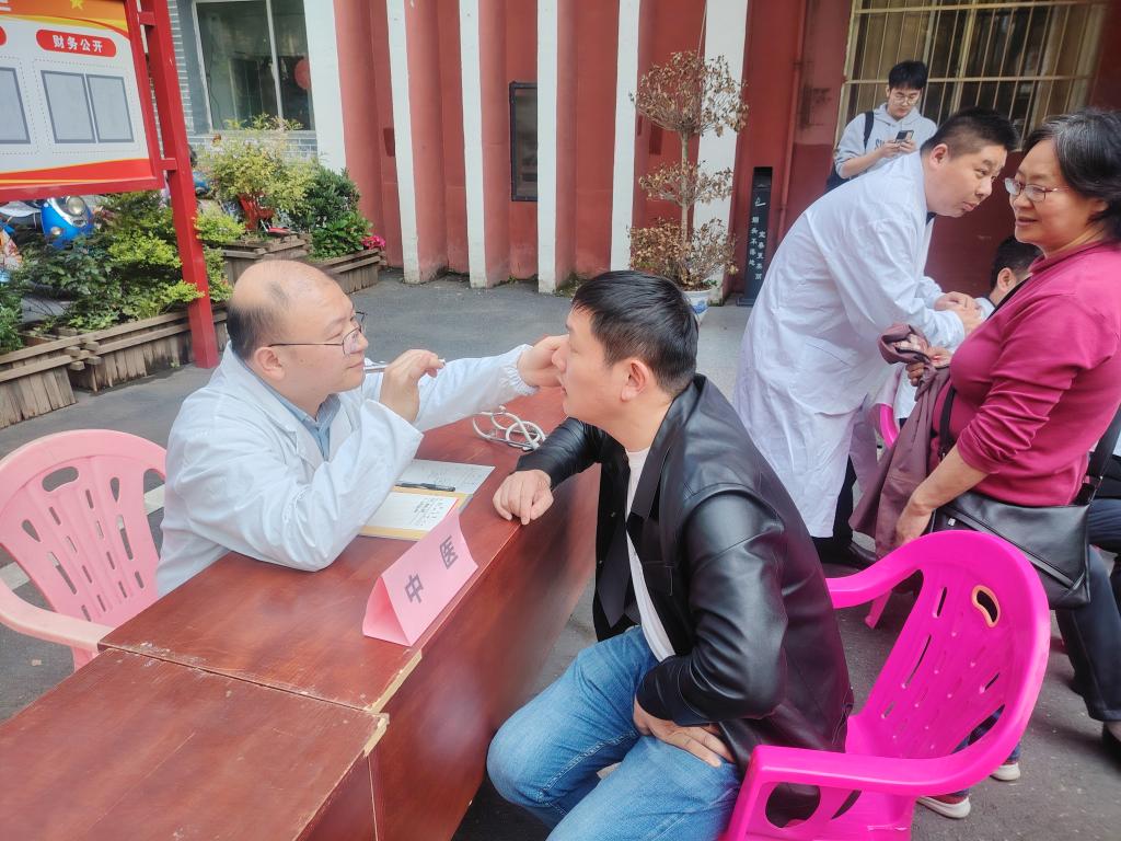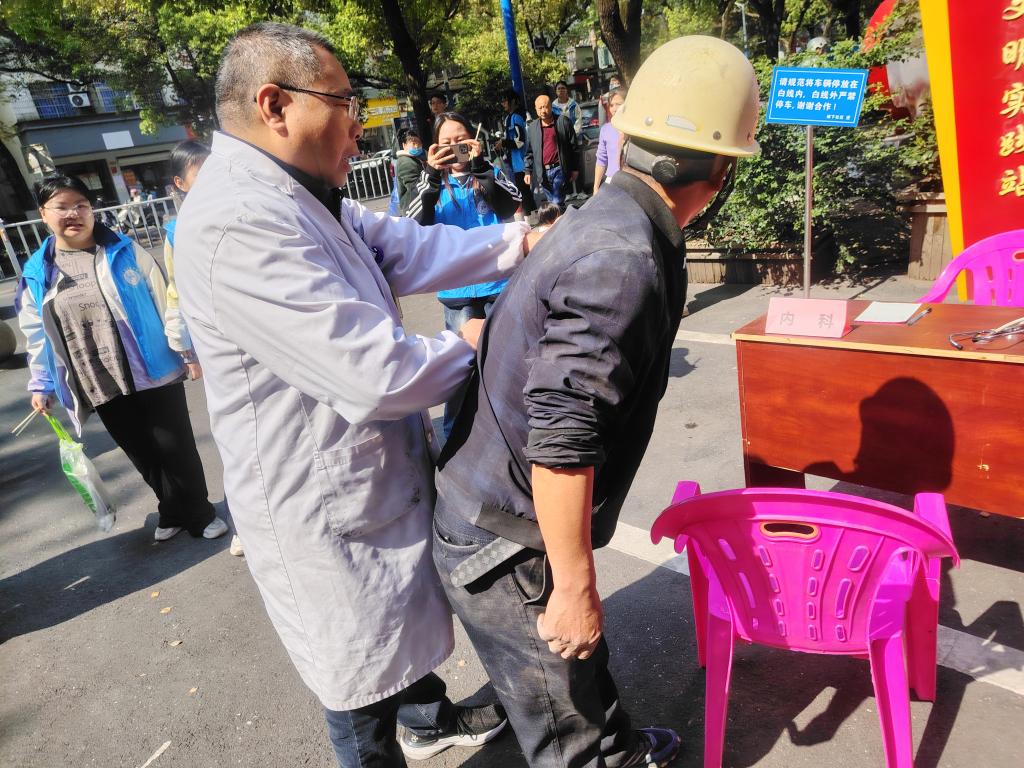 本次志愿服务包含健康讲座、爱心义诊以及创文护卫三项内容。健康讲座由医学院眼科医学专家左兰主讲,内容涵盖常见眼部疾病预防、健康护眼的生活方式等。爱心义诊由内外科、中医、康复医生以及学生志愿者负责,为居民提供免费的血压、血糖等基础检查服务,并提供健康咨询以及健康建议。其余党员教师及入党积极分子则沿中山西路两侧清理路面垃圾,摆放整齐路边停放的电动车,同时向居民发放健康知识宣传手册。